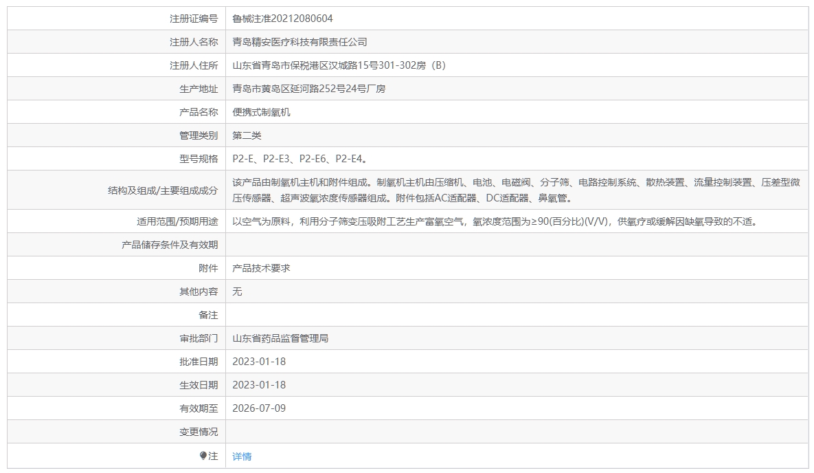 描述: 便携式制氧机由制氧机主机和附件组成。制氧机主机由压缩机、电池、电磁阀、分子筛、电路控制系统、散热装置、流量控制装置组成。 附件包括电源适配器、鼻氧管;鼻氧管为外购医疗器械。 以空气为原料,利用分子筛变压吸附工艺生产氧浓度范围为≥90%(V/V)的氧气,供氧疗或缓解各种因缺氧导致的不适。